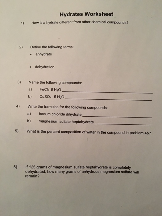 Hydrates Worksheet Answers : Hydrate Worksheet Hydrate Worksheet Name The Following Hydrates Cacl2 8 H2o Feso4 6 H2o Lioh H2o Pbcl2 3 H2o Li2cro 4 5 H2o Na2so4 10 H2o Write The Course Hero : We have a word search maker, an abc order worksheet creator, math generators, and more.